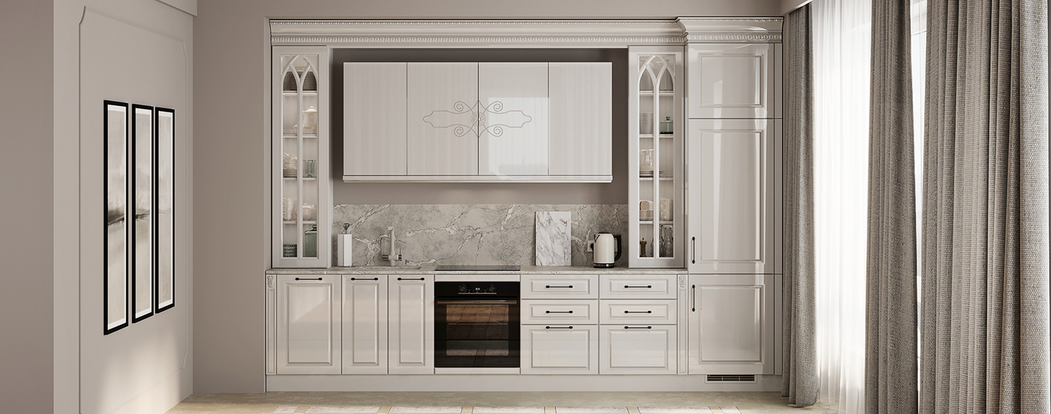 Фасады «Мария» изготавливаются из МДФ 19мм с фрезеровкой, покрытой глянцевой, текстурной или суперматовой эмалью как с применением патины, так и без. Декор фасадов можно выполнить в предлагаемых цветах эмалей и по каталогам цветов NCS и Pantone.
