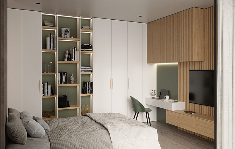 Высокая секция с чередующимися открытыми полками с подсветкой и закрытыми отделениями плавно переходит в тумбу под телевизор. Телевизор размещен на фоне вертикальных реечных панелей, занимающих всю высоту стены и добавляющих текстуру и динамику пространству. В комплекте есть небольшой, но эргономичный рабочий стол с выдвижным ящиком.