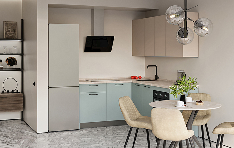 Бирюзовый оттенок нижних фасадов разбавляет бежевый, доминирующий в помещении. Такой декор подходит для любой кухни. Если кухня расположена на южной светлой стороне, прохладные оттенки нижних фасадов придадут ощущение свежести и чистоты. В кухнях со слабым естественным освещением теплые оттенки бежевого подарят интерьеру нежность и уют.
