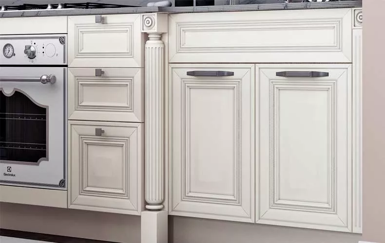 Кухонный гарнитур Летиция 3 выполнен в традиционной классической стилистике. В качестве способа декорирования применяются оригинальная фрезеровка фасадов, фигурные накладки на витражи и дверцы шкафов. Фасады с витражами и подсветкой создают на кухне уютную домашнюю атмосферу и подчёркивают достоинства классического стиля. Светло-серые тона кухни придают мебели сдержанность и, в тоже время, задают стиль интерьера.
