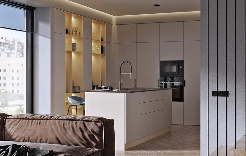 Кухонный гарнитур Маттео 44 выполнен в стиле джапанди п-образной конфигурации. Есть и колонки для встроенной техники, и секции с открытыми полками, и шкафы для хранения. Используется локальная подсветка элементов кухни. Мойка и варка разнесены по разным сторонам.