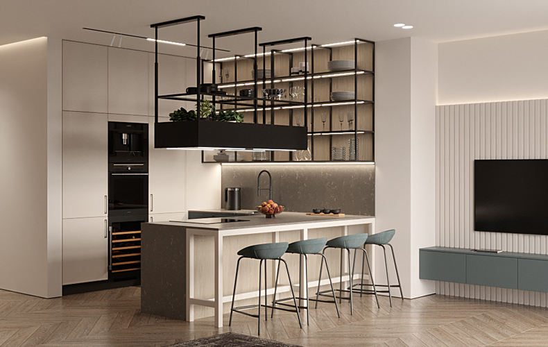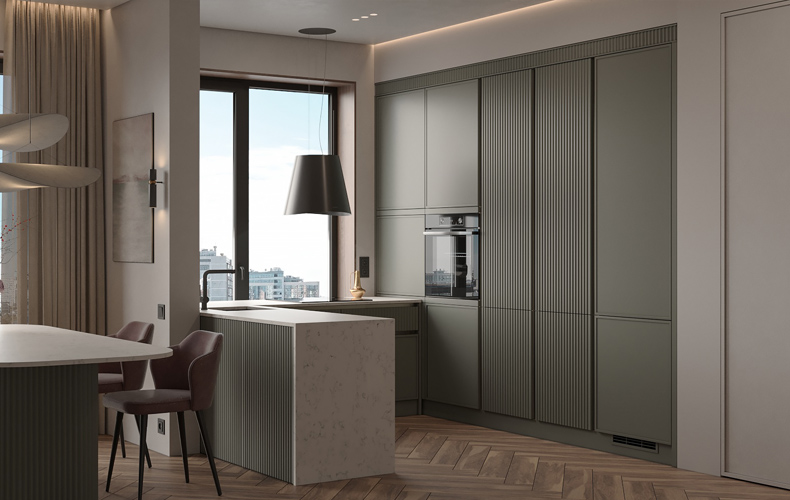 Декор минималистичный, основной акцент сделан на текстуре материалов и лаконичных формах. Встроенная подсветка подчеркивает красоту гарнитура, визуально расширяет пространство и делает кухню более светлой.